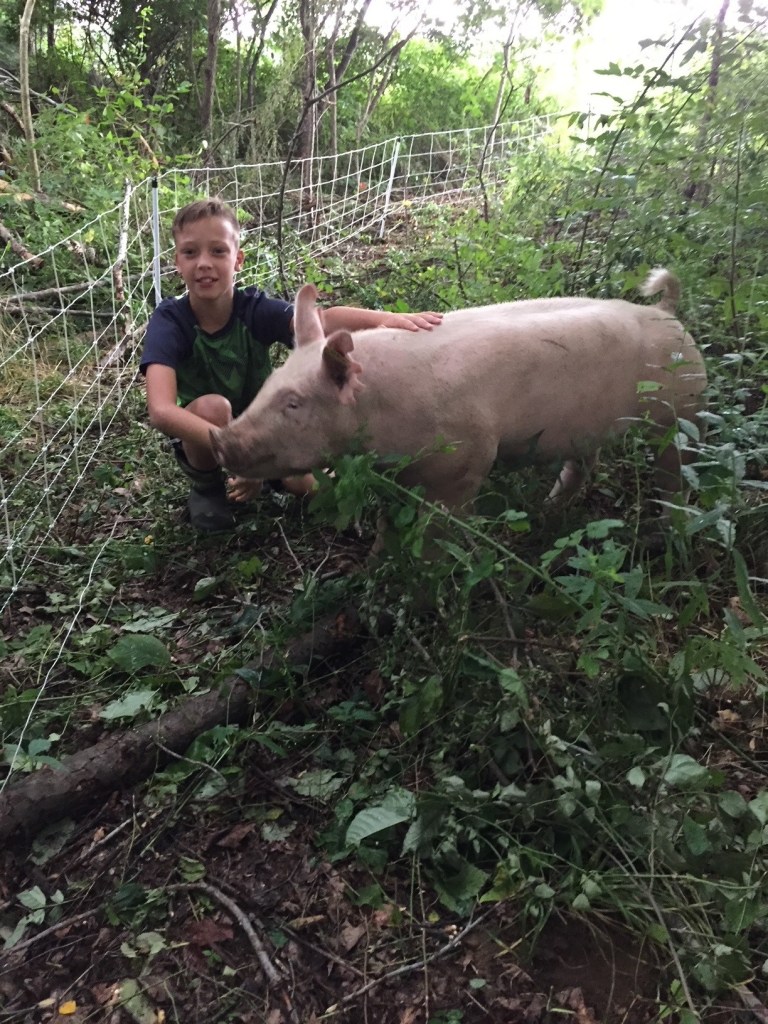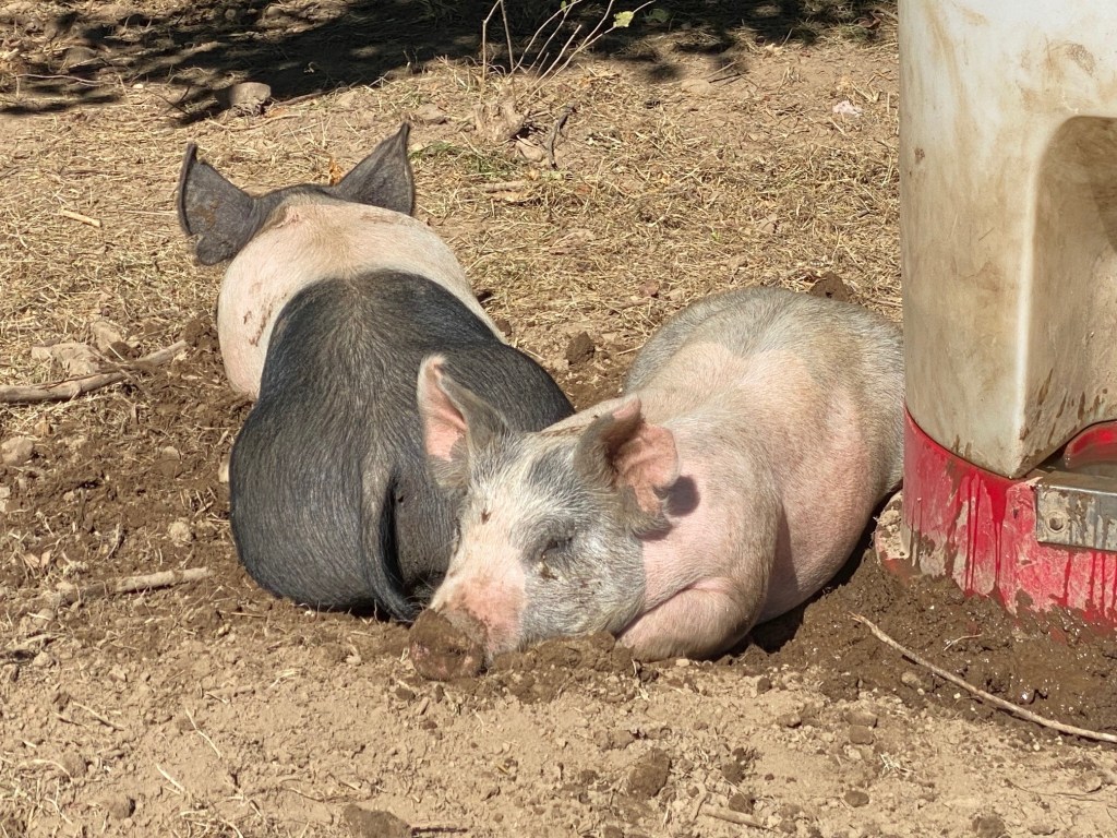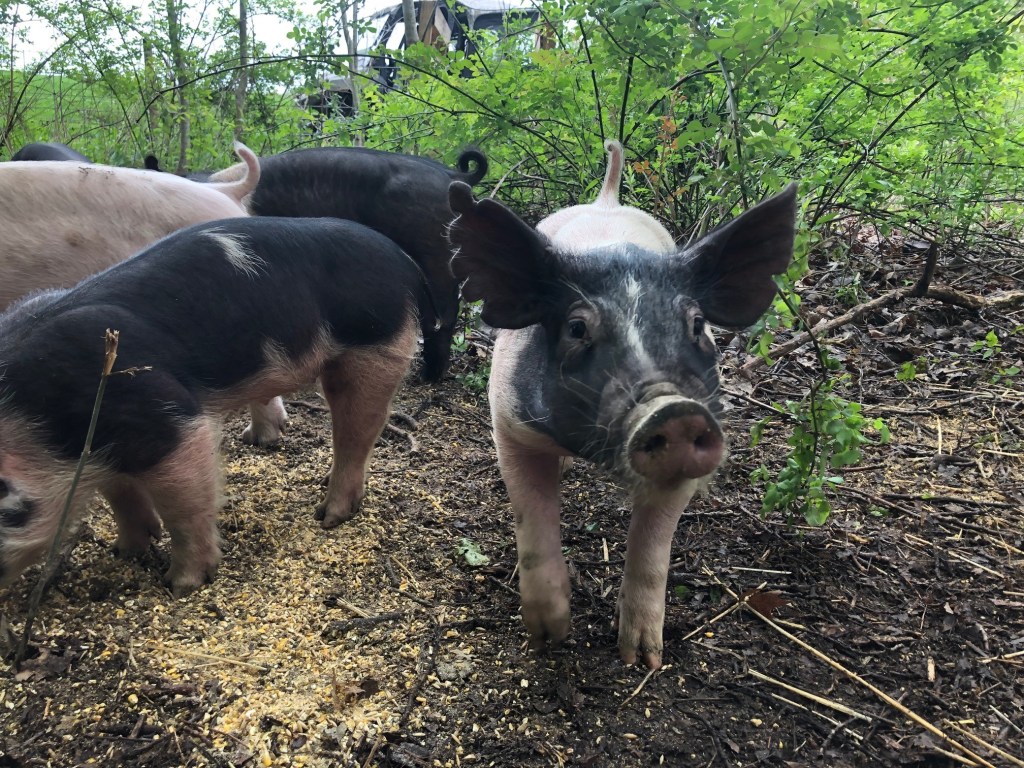 We raise heritage breed pigs, who live in the woods and forage just like they would in the wild. They are supplemented with non-GMO feed and are not treated with antibiotics. They live a happy cage free life and are rotationally grazed every week to be assured there is always fresh mud to play in!