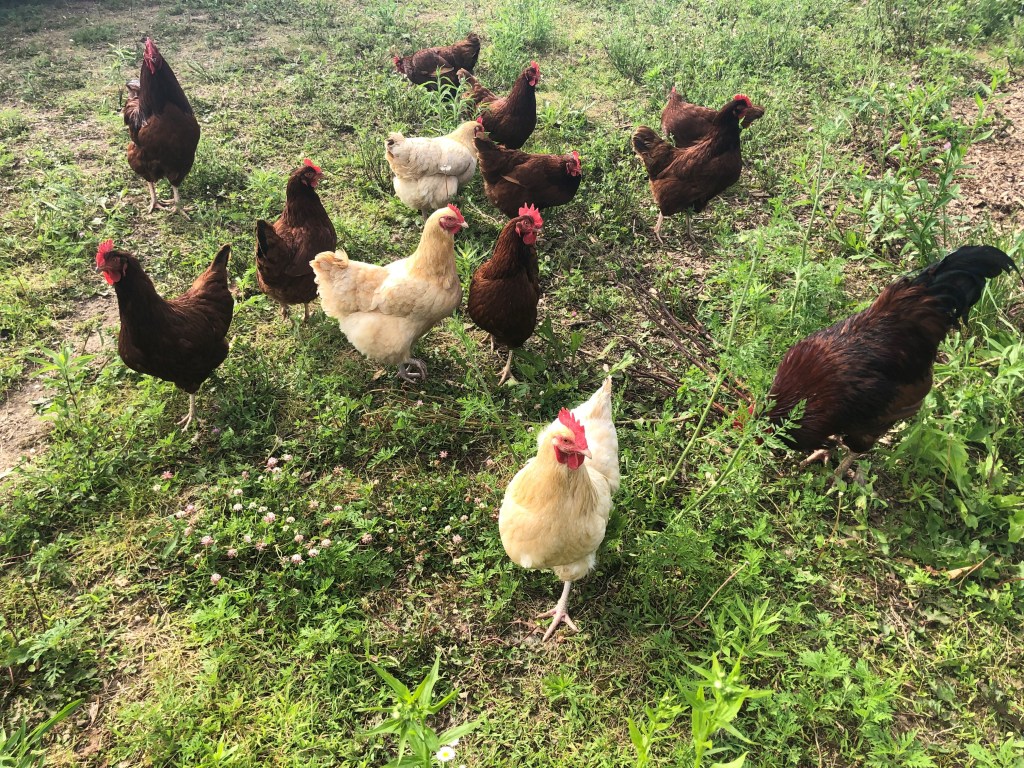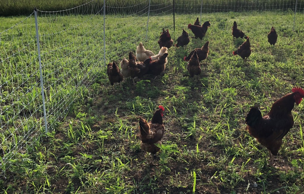 We raise pastured poultry, our chickens are never caged but are house in a chicken tractor to protect them from predators. They are moved to fresh grass twice daily and fed non GMO feed!